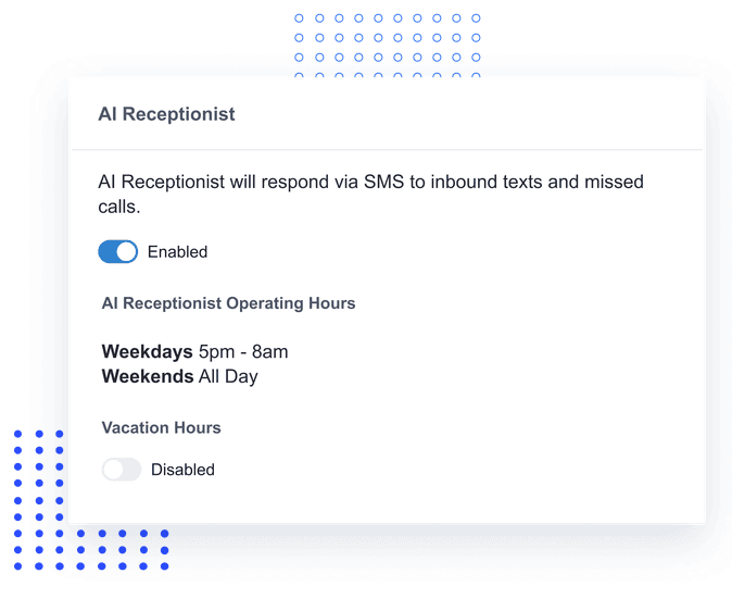 Keep your AI Receptionist on 24/7, or set custom hours and schedules to control when it’s active.